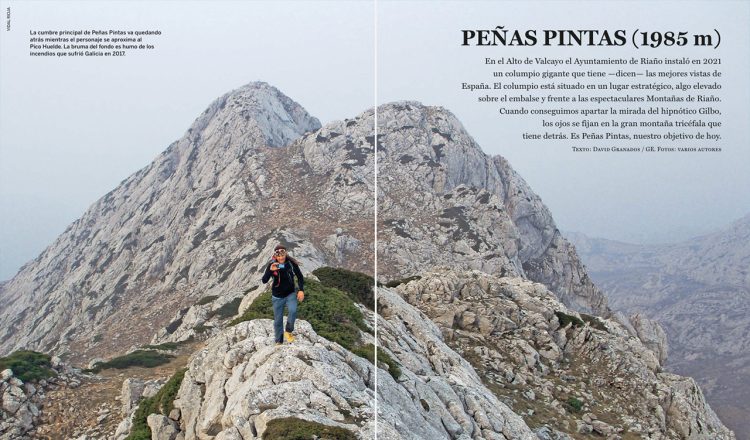 En el Alto de Valcayo el Ayuntamiento de Riaño instaló en 2021 un columpio gigante que tiene —dicen— las mejores vistas de España. El columpio está situado en un lugar estratégico, algo elevado sobre el embalse y frente a las espectaculares Montañas de Riaño. Cuando conseguimos apartar la mirada del hipnótico Gilbo, los ojos se fijan en la gran montaña tricéfala que tiene detrás. Es Peñas Pintas, nuestro objetivo de hoy.