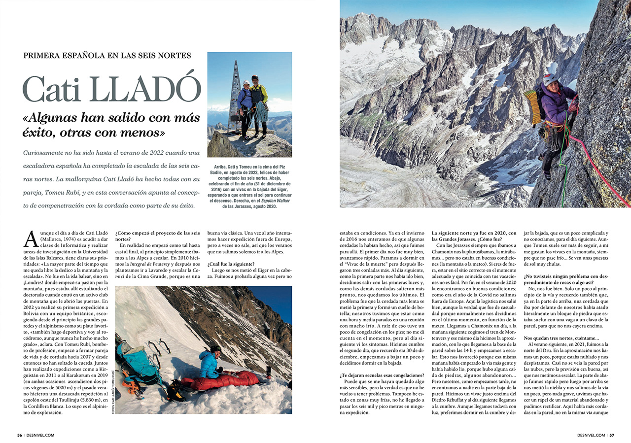 Curiosamente, no ha sido hasta el verano de 2022 cuando una escaladora española ha completado la escalada de las seis caras nortes. La mallorquina Cati Lladó ha hecho todas con su pareja, Tomeu Rubí, y en esta conversación apunta al concepto de compenetración con la cordada como parte de su éxito.