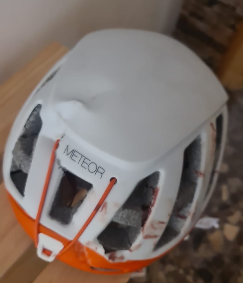 El golpe le dio en el casco ya que él se había acercado a la pared para intentar ponerse lo más seguro que podía, pues las piedras a menudo rebotan hacia fuera, aunque esta vez no fue el caso. Él se inclinó hacia delante y la piedra impactó la parte trasera de la cabeza. Bajo el impacto, todo su tronco superior acompañó la piedra inclinándose hacia delante, por lo que pienso que no habrá recibido toda la fuerza del golpe en la cabeza.