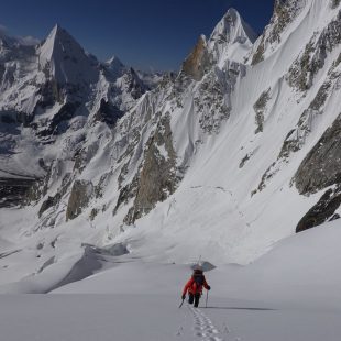 La escalada discurrió de forma fluida y rápida. Veloz incluso al final, cuando ya se encontraban cerca: “Excitados con la idea de ver la calidad de la nieve sobre el Nicho, terminamos los largos más fáciles a la carrera. ¡Bingo! La nieve es buena”, cuenta Guillaume Pierrel, que alcanzó la parte alta del nevero en 13 horas desde la partida.